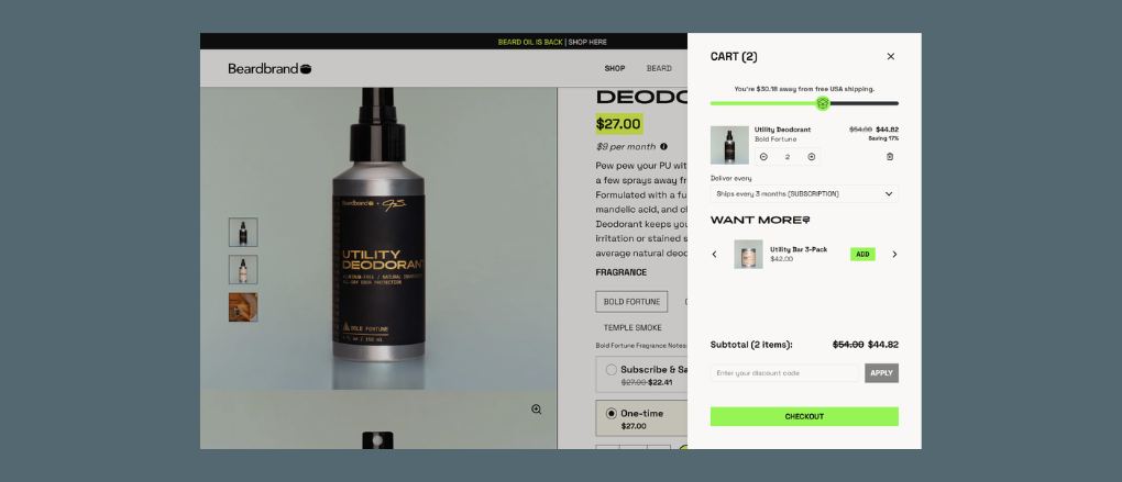 Right below it, Beardbrand suggests a Utility Bar 3-Pack with a one-click Add button. This combination is strategic: the cross-sell feels natural, and the progress bar gives customers a clear reason to accept the offer.