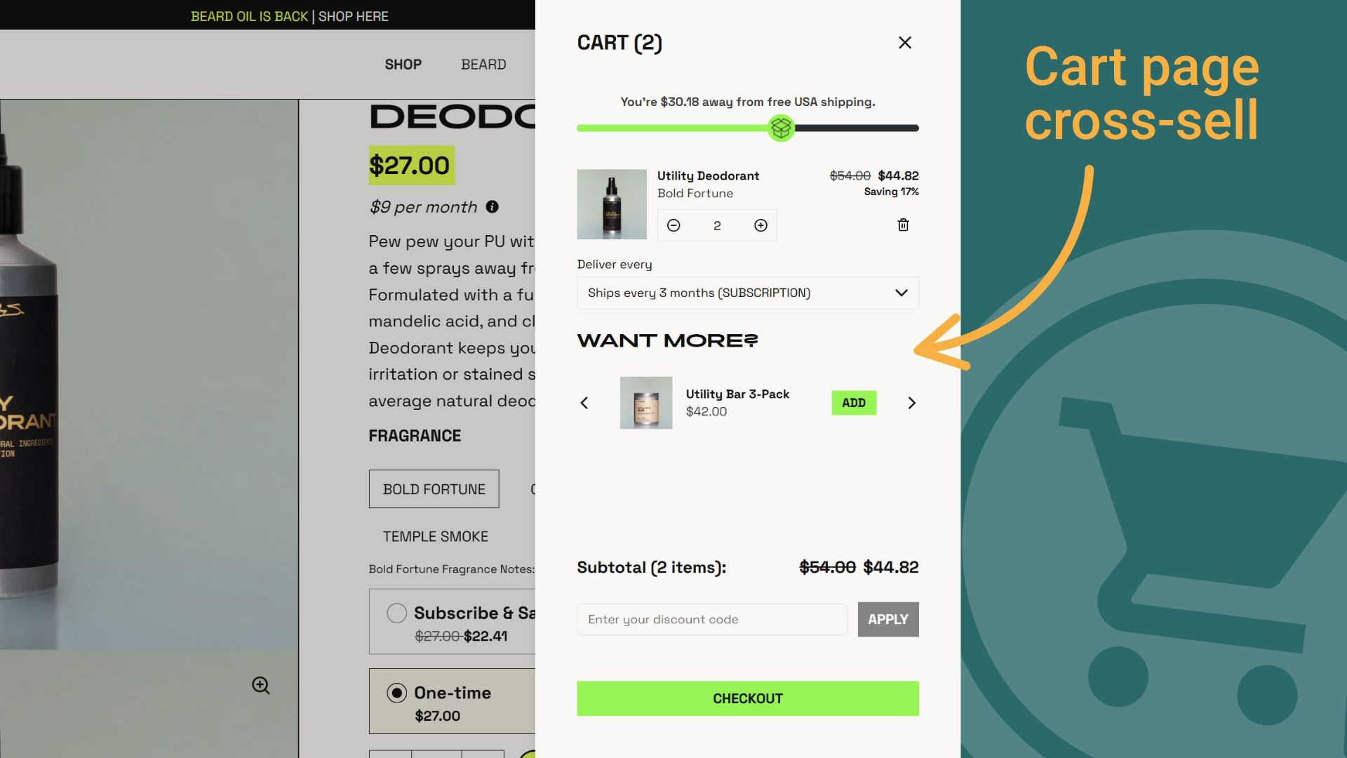 Beardbrand uses cart cross-sells in a smart way. When a shopper adds a product, the cart drawer not only shows their items but also includes a progress bar toward free shipping.