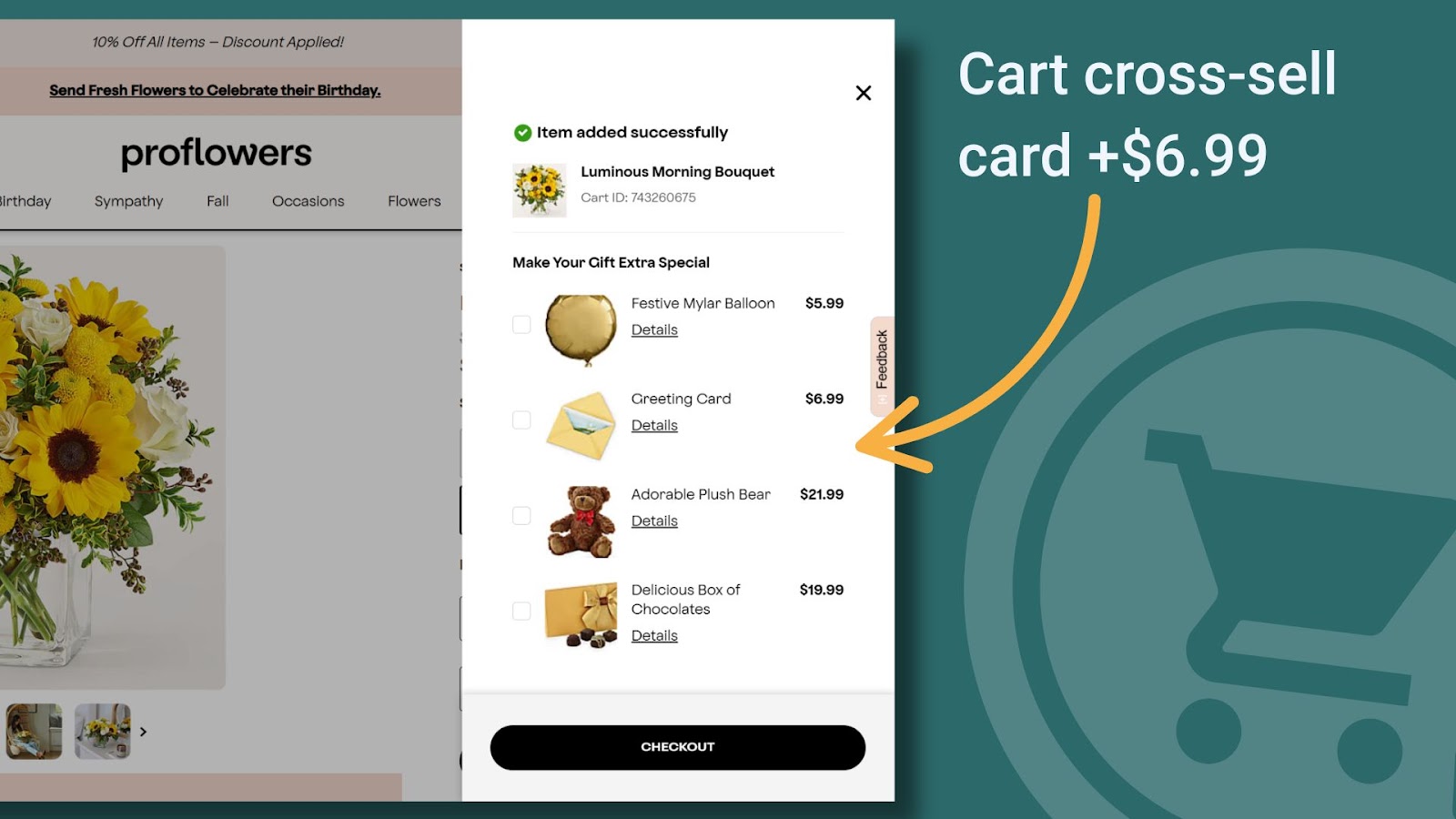 ProFlowers is a great example of how small, well-placed upsells can add up to big revenue. Instead of overwhelming customers, they use three simple upsell tactics that feel natural within the buying journey.