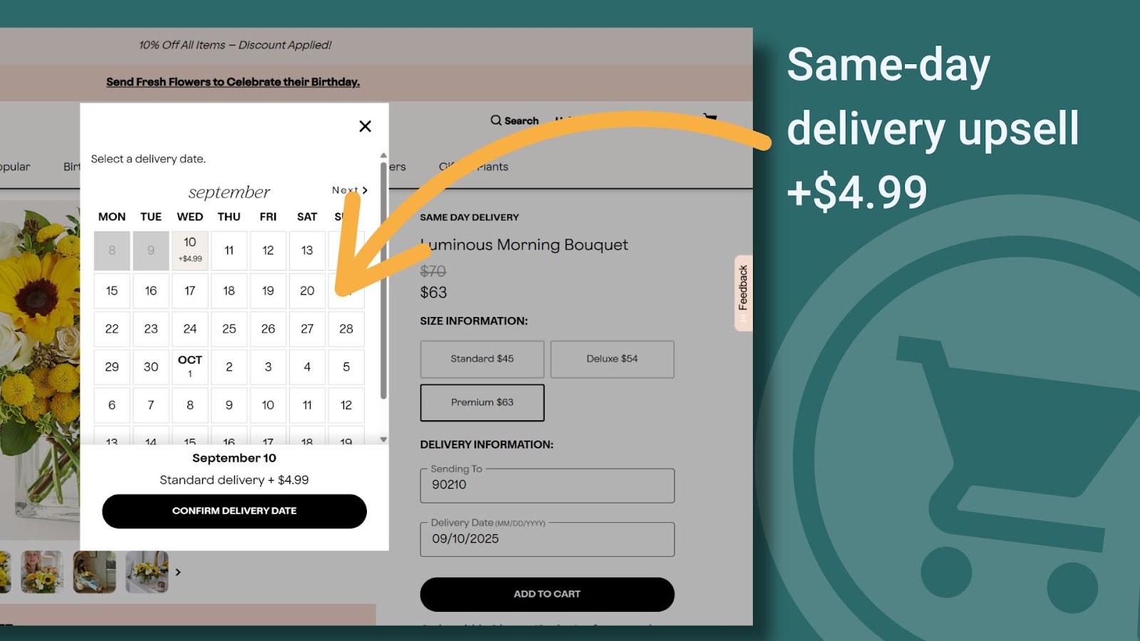 When choosing a bouquet, shoppers can easily upgrade from “Standard” to “Deluxe” or “Premium.” This is a classic upsell - offering a better version of the same product at a slightly higher price.
