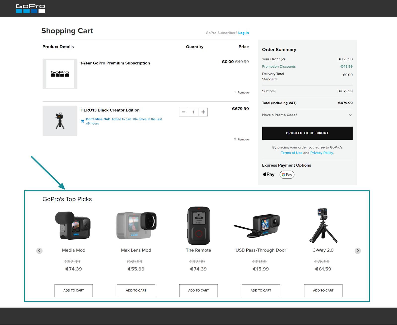 - Example: GoPro suggests various add-ons and mods that pair perfectly with the product in cart.