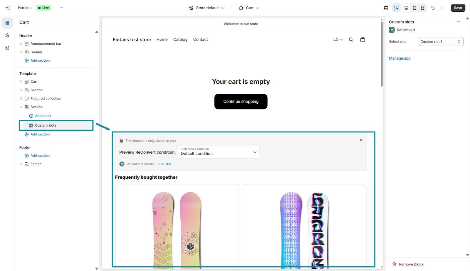 Open the Shopify Theme Editor, pick the target template, then position your ReConvert widget on the chosen page. Save and preview to confirm placement.