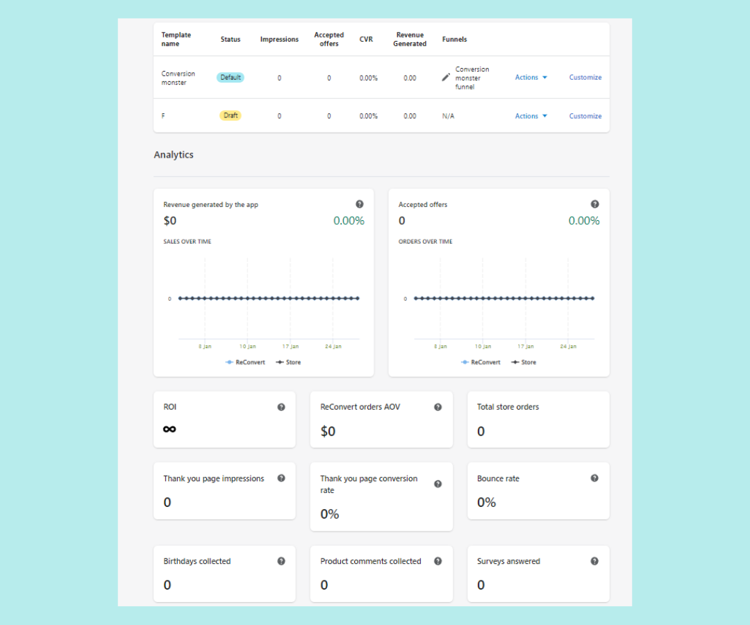 - ReConvert AOV – Allows merchants to see the direct result of ReConvert’s funnels and thank you pages on their store.