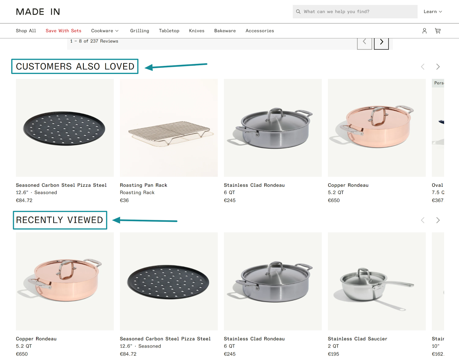 Secondly, at the bottom of its product pages, shoppers see “Customers Also Loved” and “Recently Viewed” sections that change dynamically based on browsing behavior.