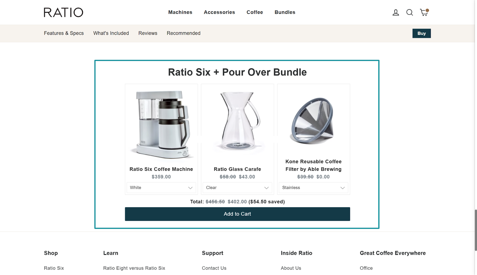 Ratio Coffee drives bigger orders by bundling its coffee machine with accessories. On the product page, shoppers see the Ratio Six + Pour Over Bundle, which includes a discounted glass carafe and a reusable filter offered for free.
