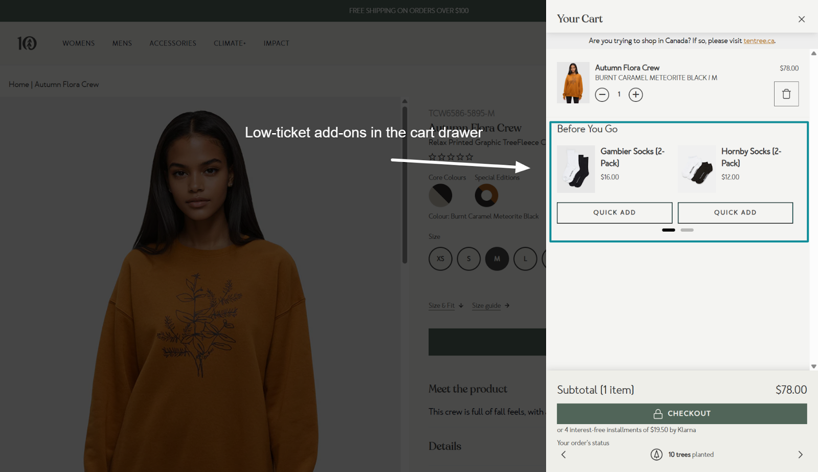 Tentree shows how effective the cart drawer upsells can be for small add-ons. When a shopper adds a crewneck to their cart, the drawer opens with a “Before You Go” section suggesting low-ticket items like socks.