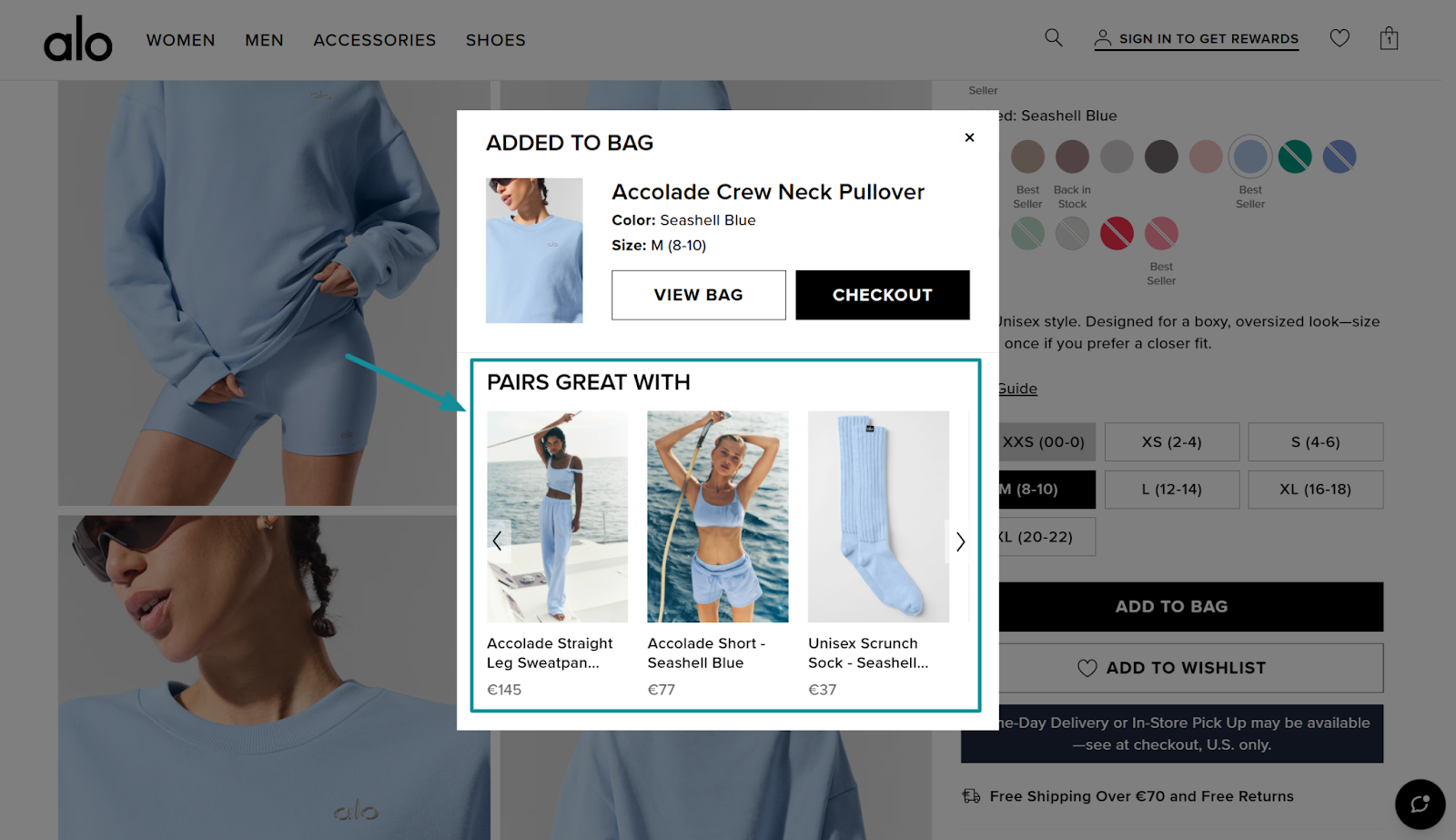 ALO takes a different approach by showing upsells the moment an item is added to the cart. When a shopper clicks “Add to Bag,” a pop-up appears with a “Pairs Great With” section featuring complementary products like matching shorts, sweatpants, or accessories.