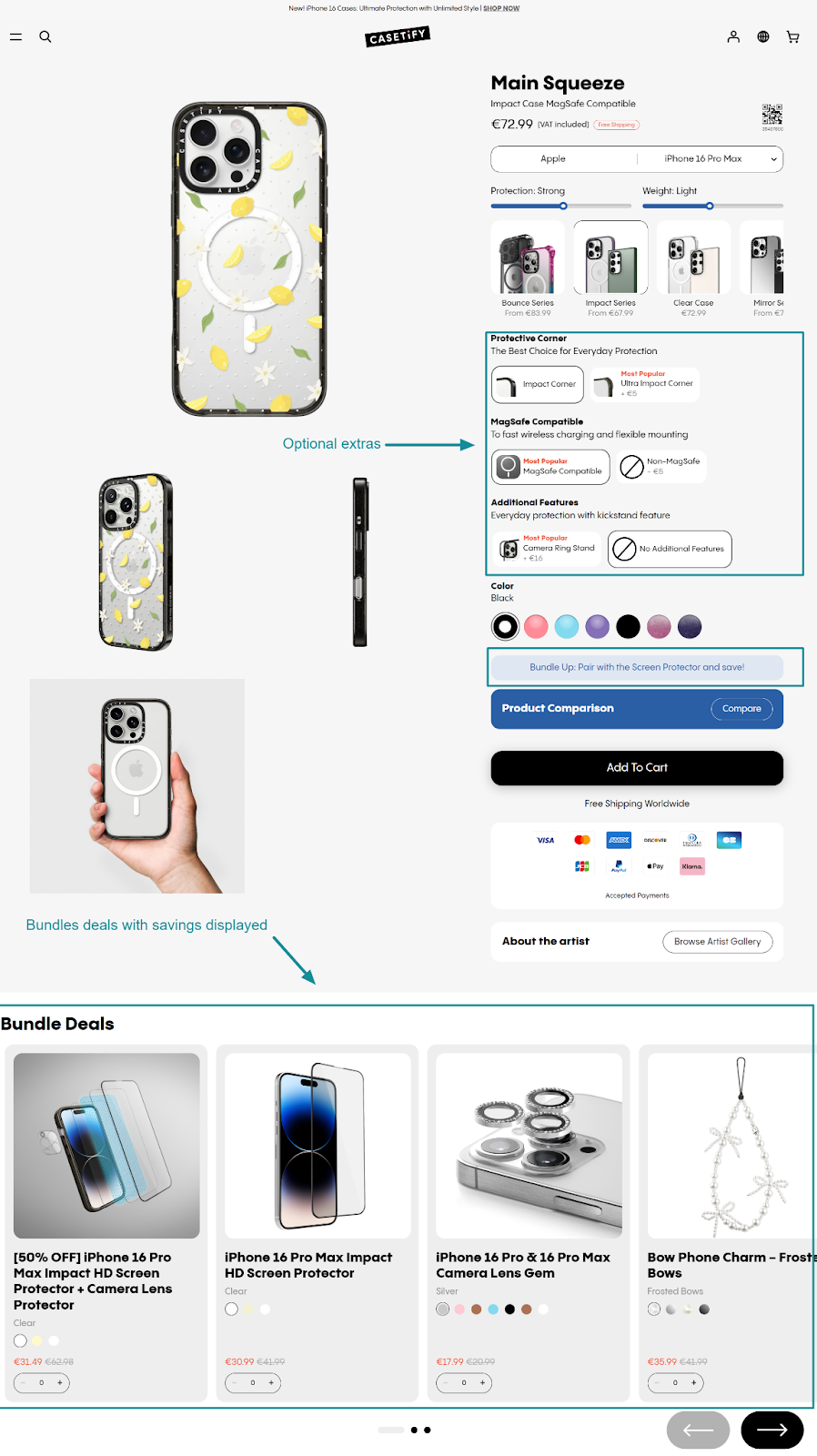 CASETiFY uses a smart mix of optional add-ons and bundle deals to boost AOV. On the product page, shoppers can upgrade features like MagSafe compatibility or add a camera ring stand. Further down, they see discounted bundle options such as a case plus screen protector.