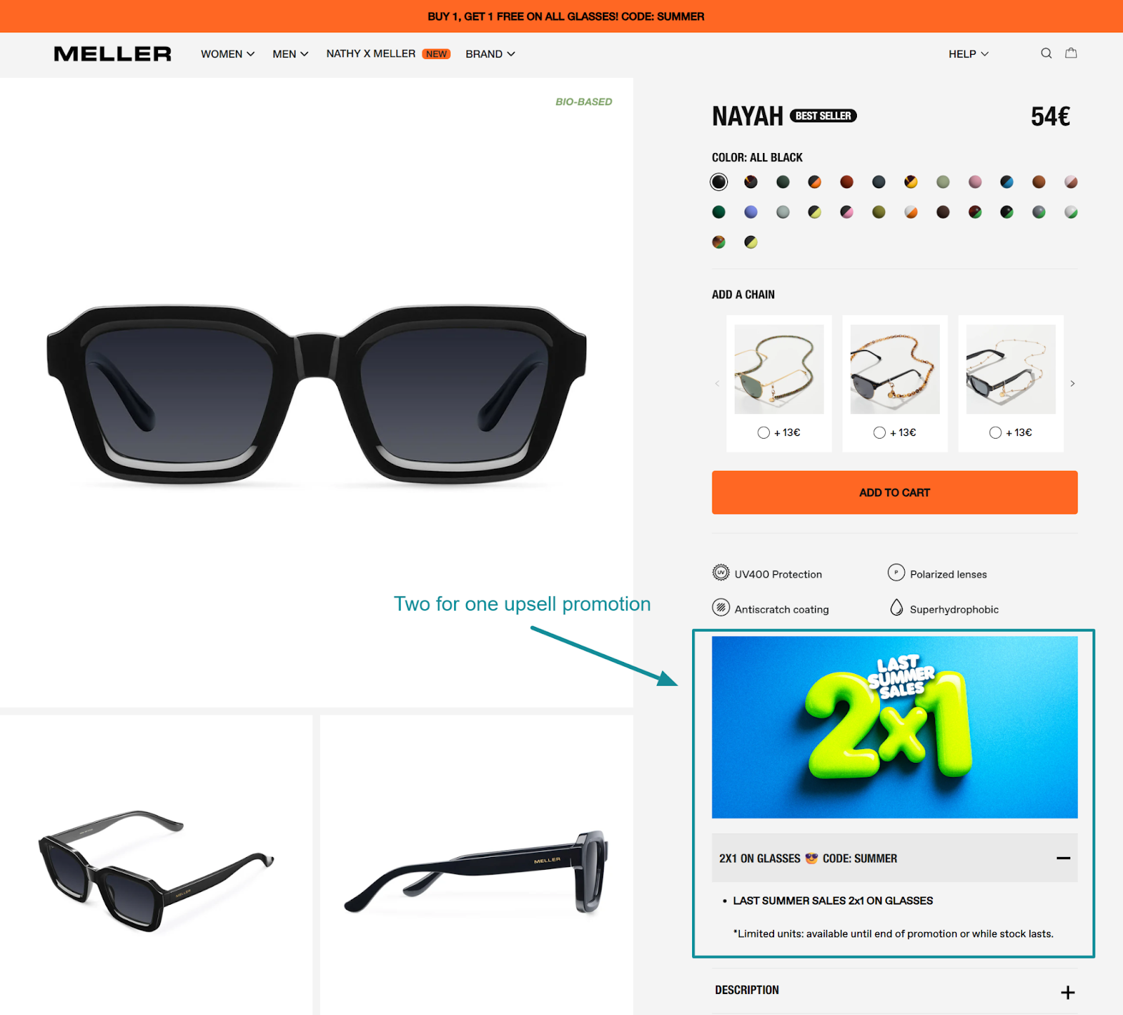 Meller drives more purchases with a seasonal two-for-one promotion on its sunglasses. On the product page, shoppers see a clear “2x1” deal highlighted, which encourages them to grab more than one pair in a single order.