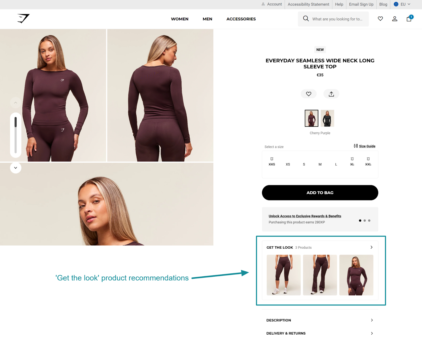 Gymshark nails product page upsells with its “Get the Look” block. When you view a top, the page shows matching leggings and other pieces the model is wearing. This makes it easy for shoppers to buy the full outfit instead of just one item.