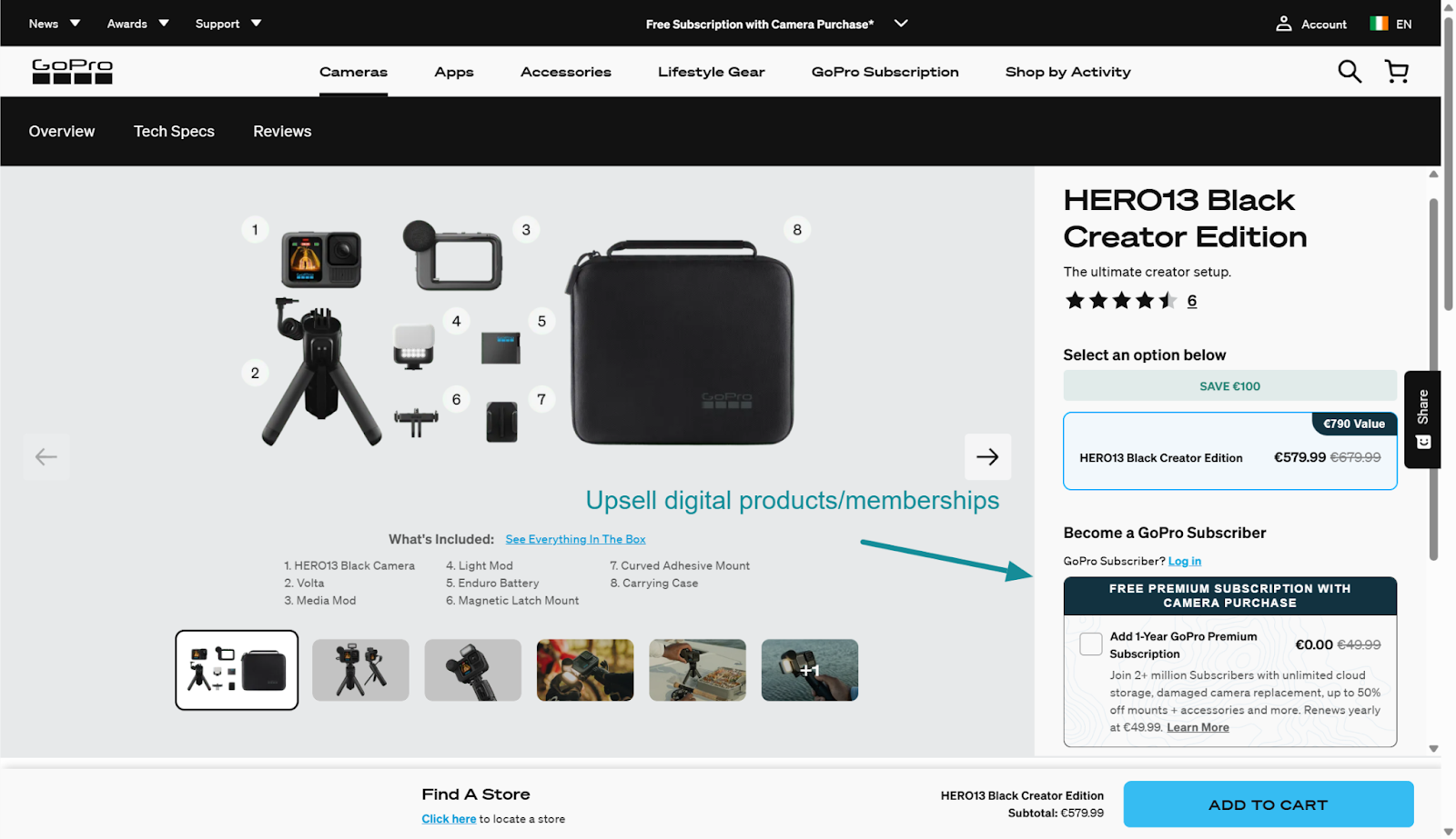 GoPro goes beyond physical add-ons by upselling digital memberships directly on the product page. When you buy a camera, you can add a one-year premium subscription for free, with billing kicking in after 12 months.
