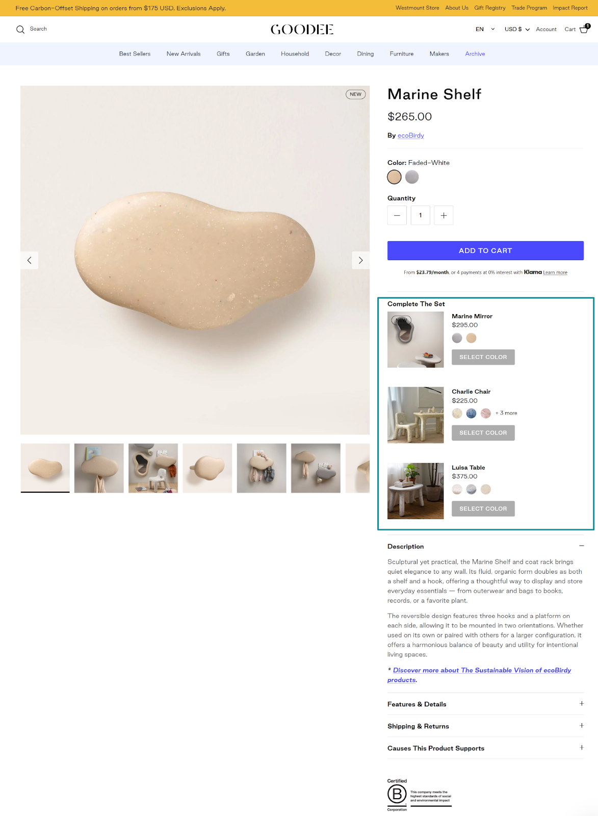 Goodee uses a “Complete the Set” block on its product pages to encourage bigger purchases. For example, when viewing a Marine Shelf, shoppers see matching items like the Marine Mirror, Charlie Chair, and Luisa Table.