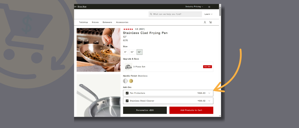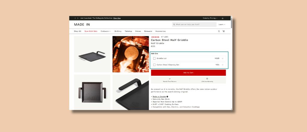 Made In uses personalization to make upsells feel natural. First off, they offer customers relevant cross-sells to each product. In this case the customer can add a ‘griddle lid’ and/or a .carbon steel cleaning kit’.