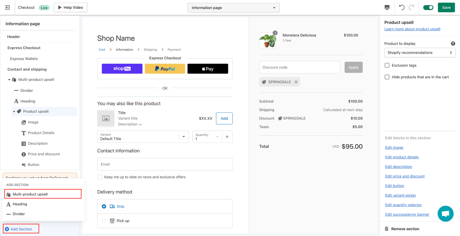 Click Add Checkout Section and choose your placement, such as below the order summary or above the payment options.
