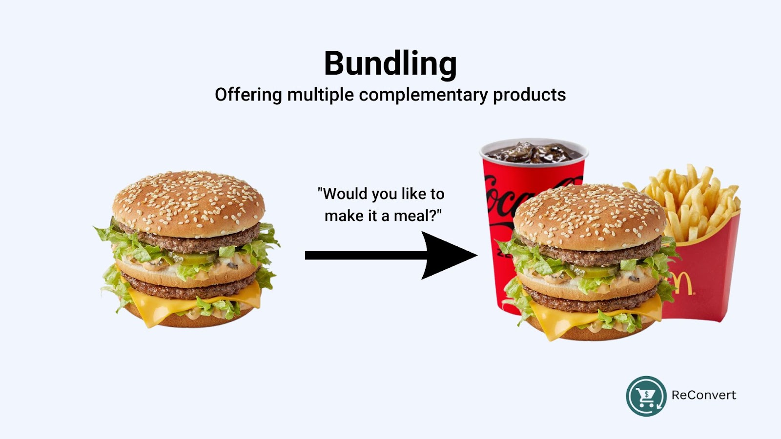 - Product Bundling: Combining multiple products into one package (often at a discount). Example: “Make it a meal for $2 extra.”