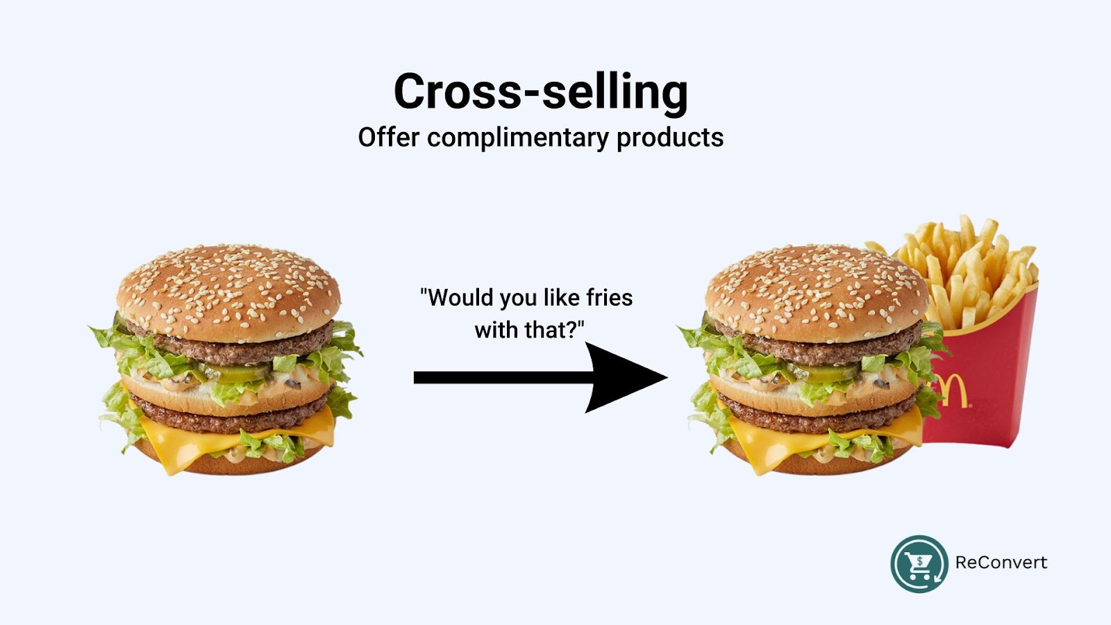 - Cross-selling: Suggesting add-ons that complement your customer’s main product: Example,’ Would you like fries with that?’