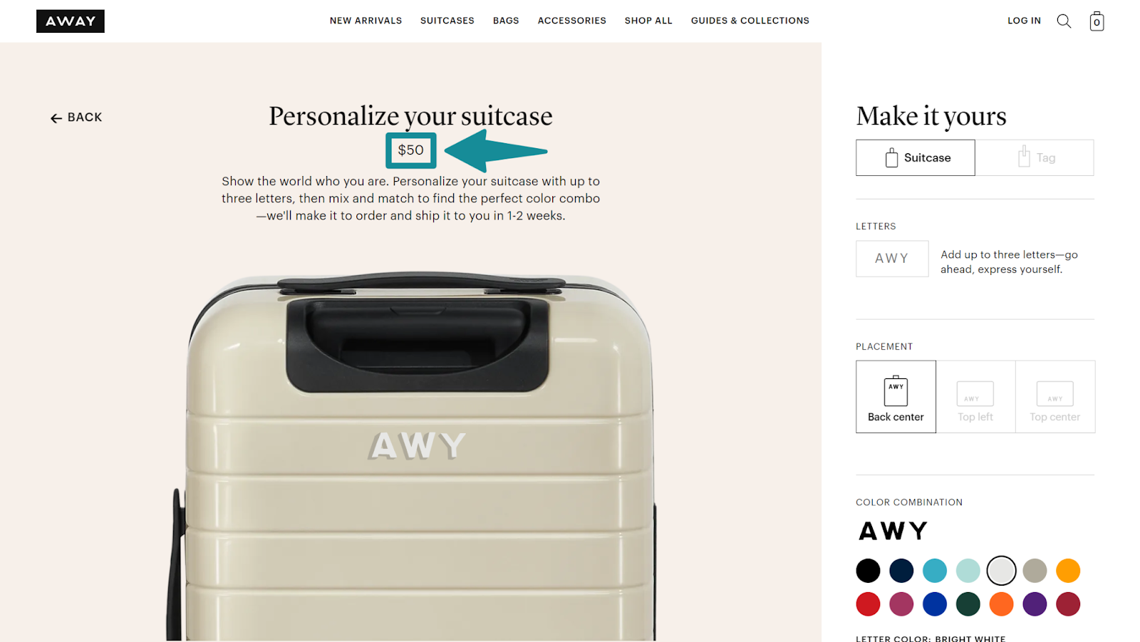 The classic upsell is moving a customer to a higher-tier version of what they’re already considering. In this example from luggage brand Away, they let customers personalize their product for $50 extra. Same category, better option.