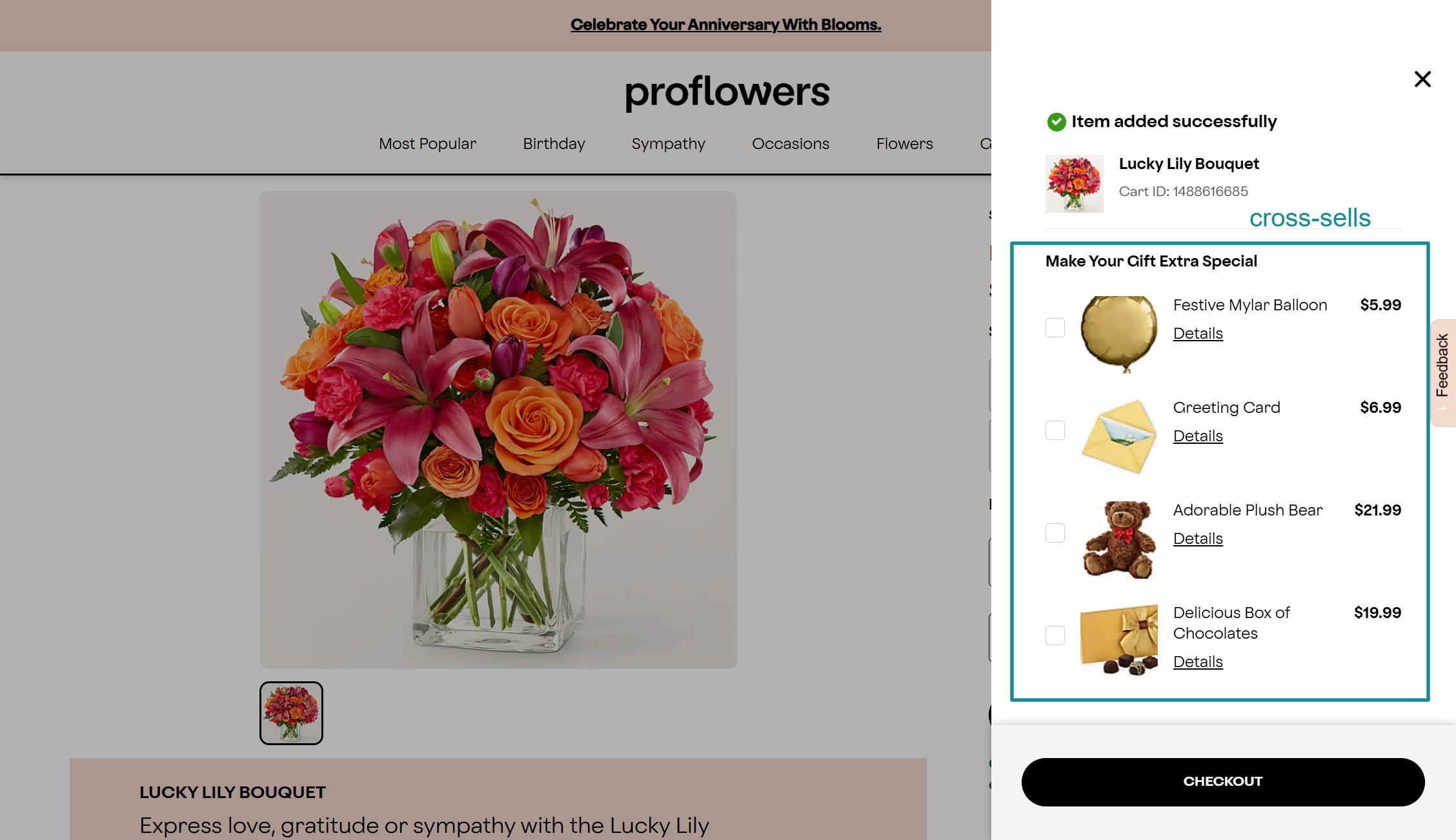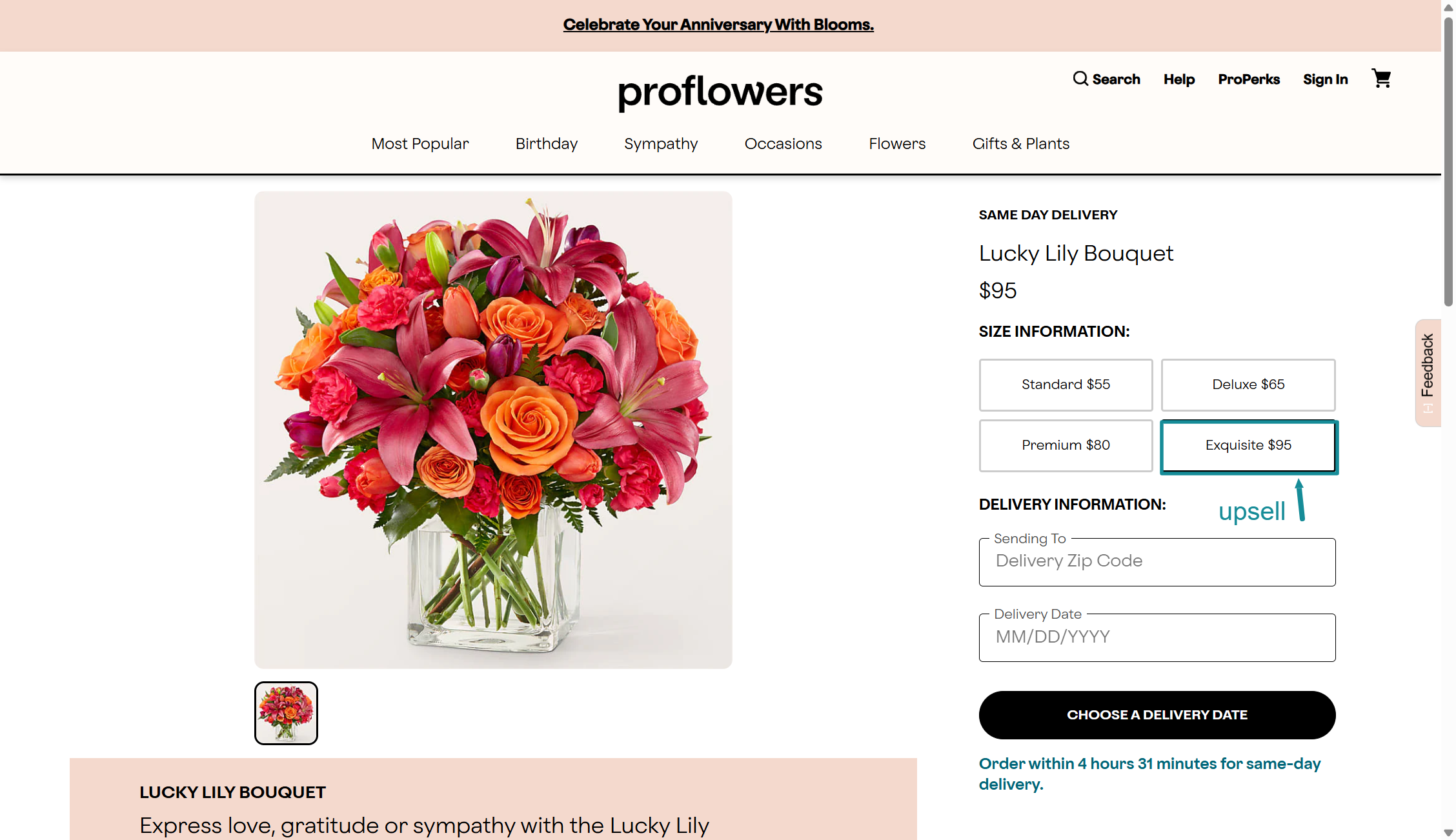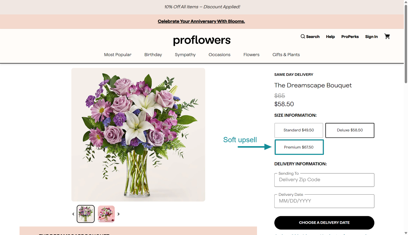 Product page upsells are the least intrusive. Think Amazon’s “Frequently Bought Together” or fashion brands’ “Complete the Look.” ProFlowers example above simply presents the customer with the option to upgrade to a premium bundle (notice the nice downsell ‘standard’ option too!)