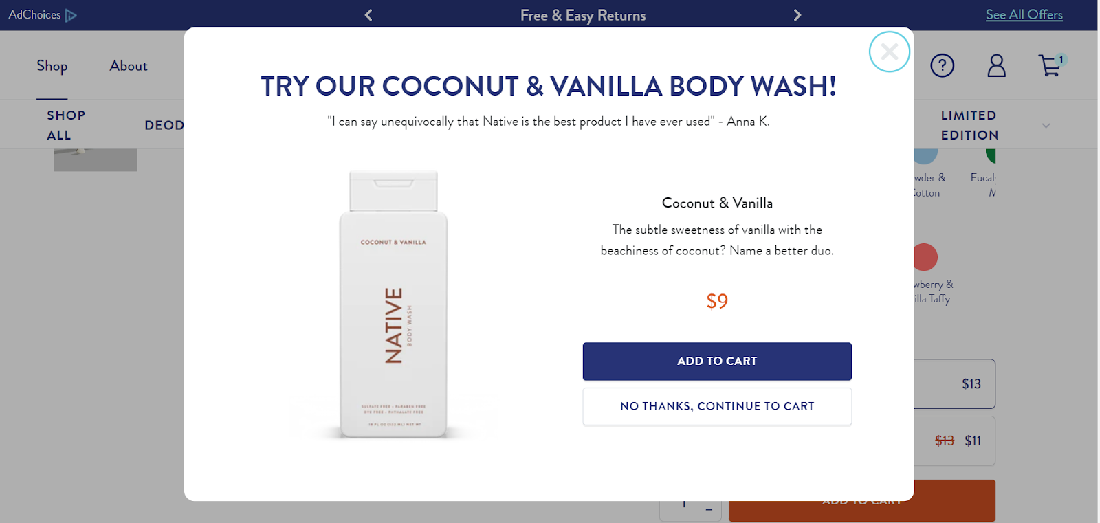 Pop-ups are more direct and attention-grabbing. Some are passive (easy to close), while others are active, requiring a yes/no response. Above is an example from cosmetics brand Native. Native includes a nice touch of social proof to boost conversions. Pop-ups are highly effective for spotlighting complementary products right before checkout.