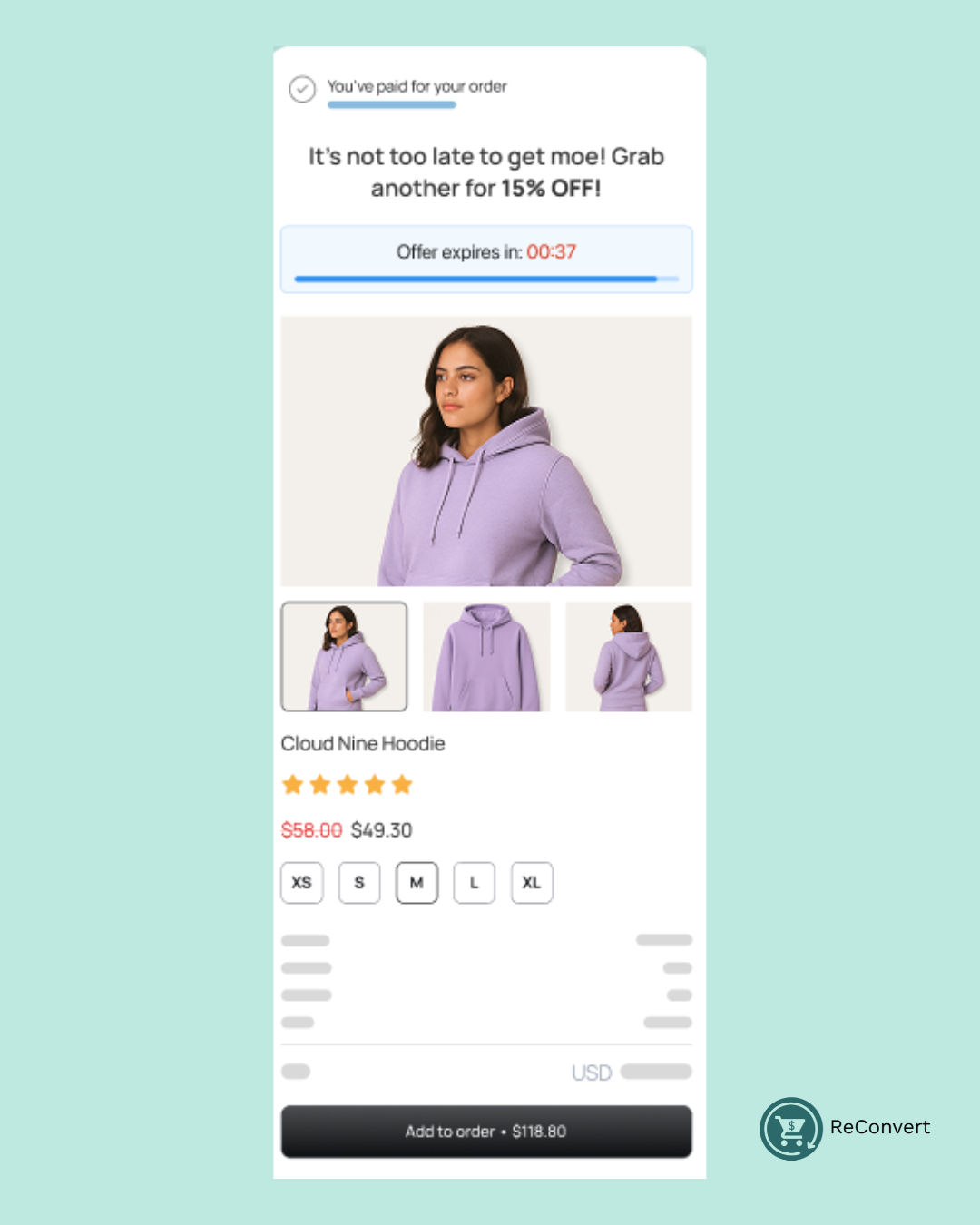 One of the most powerful formats is the one-click post-purchase upsell. Since payment details are already captured, shoppers can add upgrades or bundles instantly. There’s no extra friction, making it one of the highest-converting upsell types.