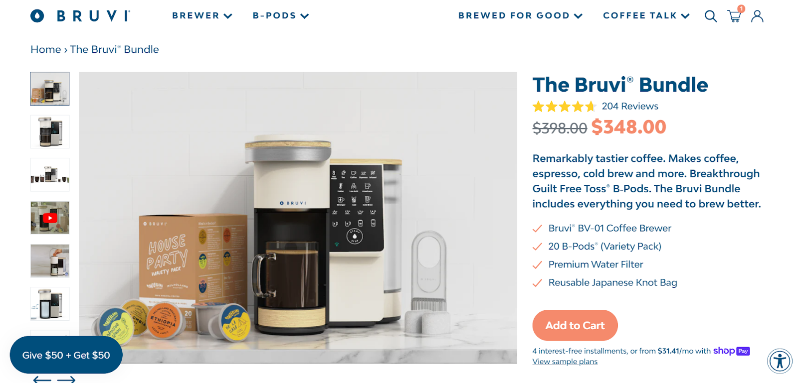 Bundling lets you package related products together at a discounted price, boosting AOV while simplifying the buying decision. Bruvi does this well by offering their coffee brewer with pods, a water filter, and a reusable bag as a single bundle. Customers see more value, and the brand secures a larger sale in one click.