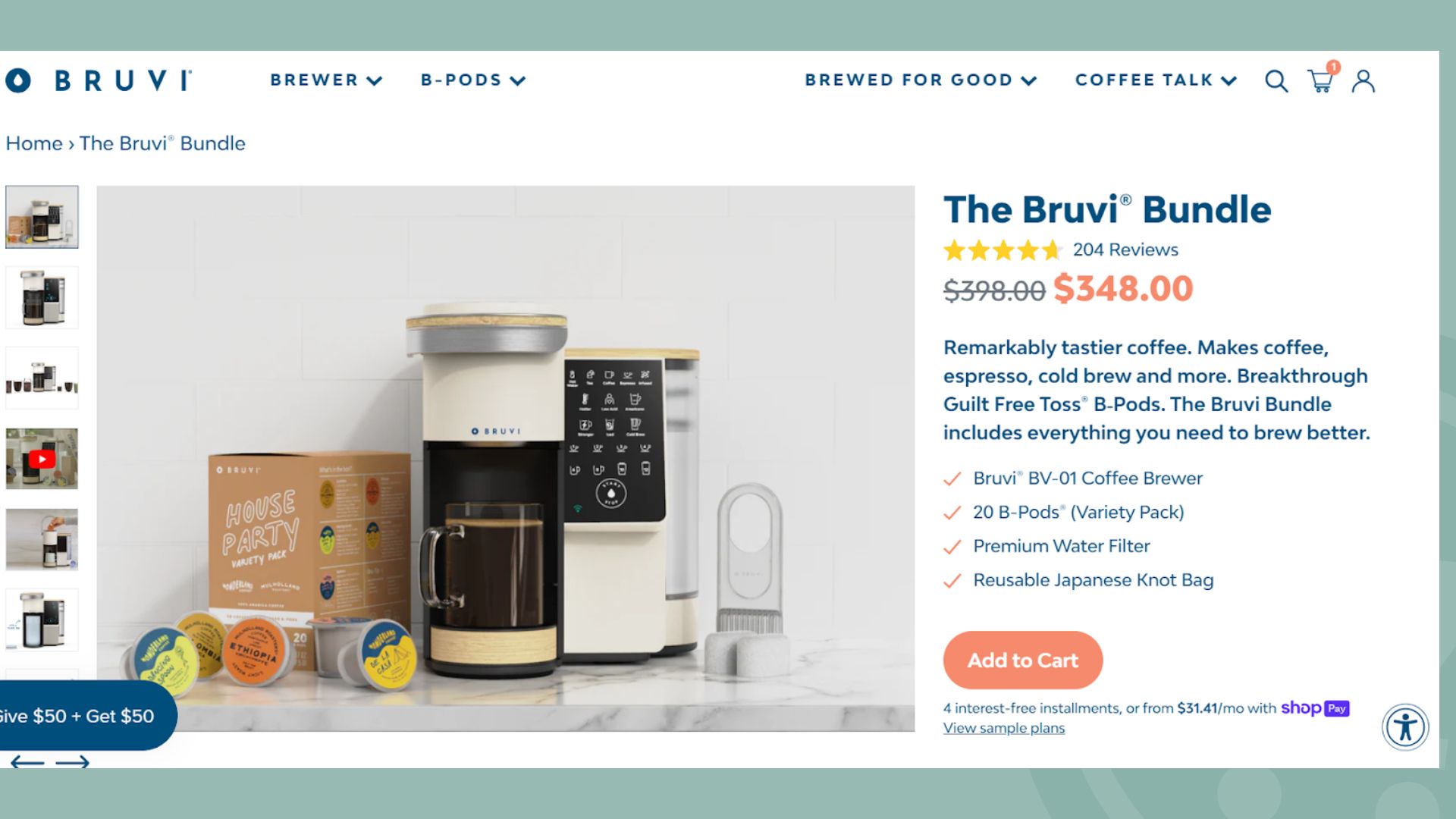 Kombinieren Sie ergänzende Produkte oder bieten Sie Mengenrabatte an. Ein Hautpflegeset, ein Essenspaket oder ein Angebot „Drei kaufen, eins gratis“ fallen alle in diese Kategorie. Hier können Sie sehen, wie Bruvi ein vergünstigtes Paket zusammengestellt hat, das alles enthält, was Käufer für den Einstieg benötigen.