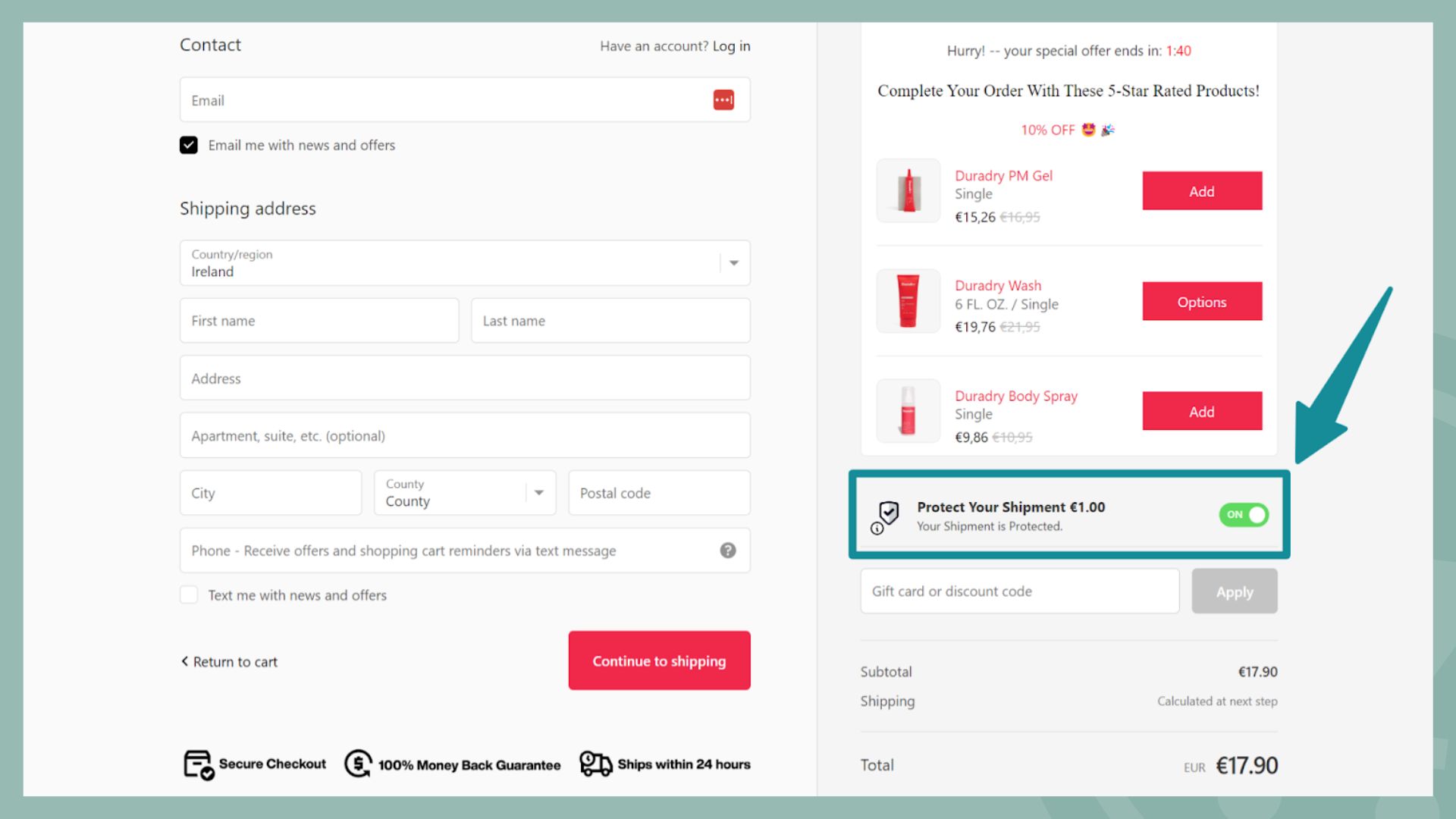 Eine weitere leistungsstarke Option. Dazu gehören eine Versandversicherung, eine Diebstahlversicherung oder ein Unfallschutz, sodass Kunden beim Checkout beruhigt sein können.